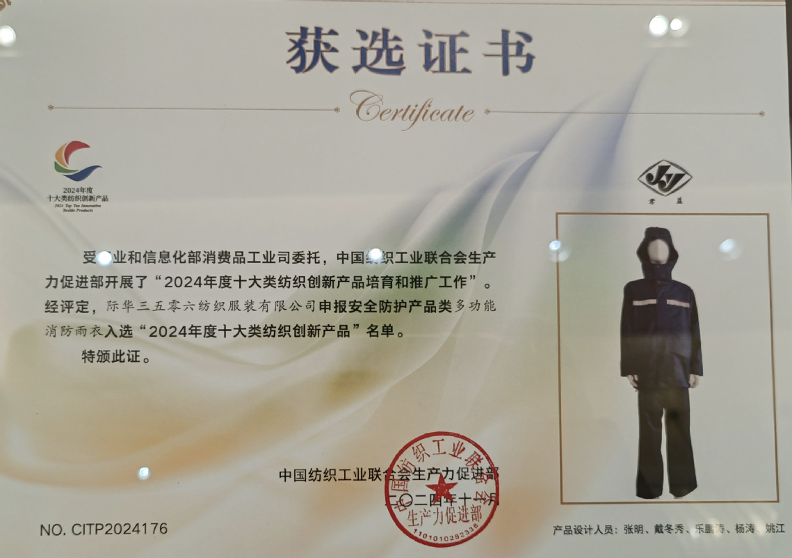 “多功能消防雨衣”获选“2024年度十大类纺织创新产品”证书