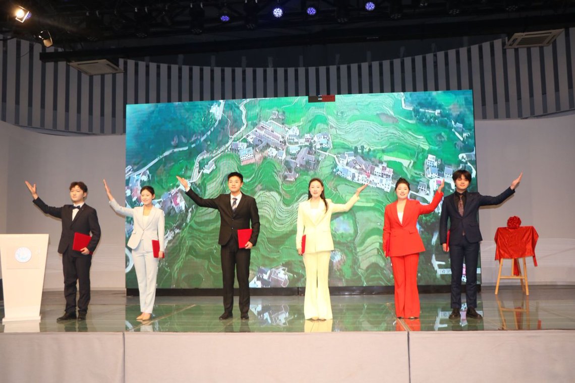 随后,播音与主持专业员工深情朗诵《在中国大地上报道》,传递新时代传媒学子讲述中国故事,报道中国力量,以生命赴使命、以行动坚信念的决心。