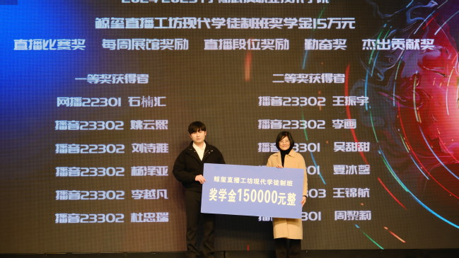 展演结束后,武汉鲸玺文化传媒有限公司总监廖谋为直播学徒制班11名员工颁发奖学金。据悉,武汉鲸玺文化传媒有限公司自2023年10月起与播音与主持专业共同培养直播学徒制班人才,本年度特别设立15万元奖学金,用于奖励表现突出的学员。