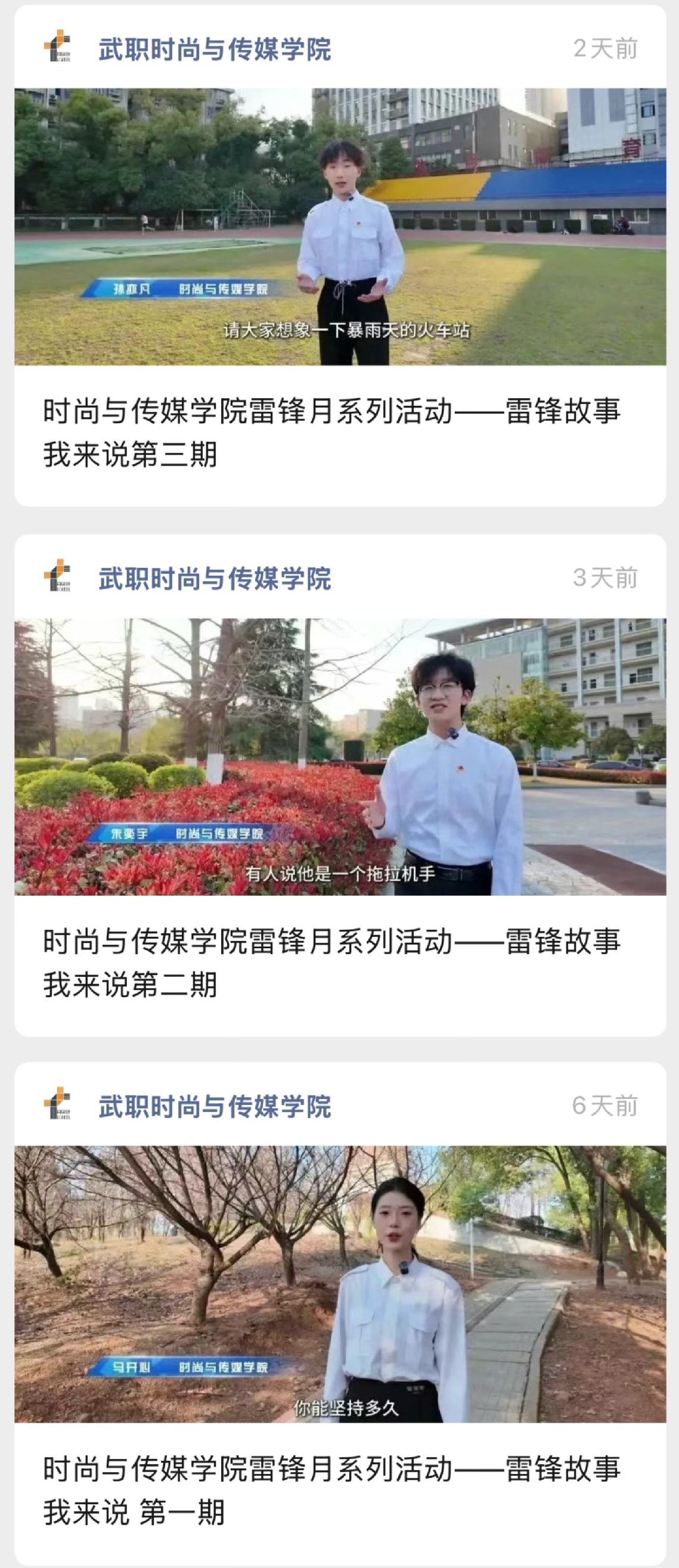 “雷锋故事我来讲”系列视频则打造沉浸式传播课堂。播音主持专业员工化身红色讲解员,以脚步丈量校园每个角落,用声音串联历史时空经纬,在花絮纷飞的林荫道上讲述雷锋的青春誓言,让红色故事在移步换景中焕发穿透时空的生命力。专业教师冯麟然评价:“这些作品既有专业深度又具传播温度,是课程思政的生动实践。”