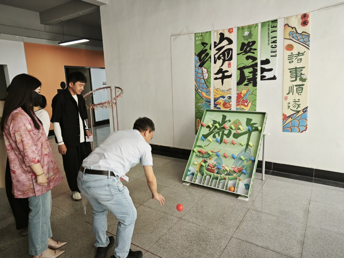 现场还布置了“端午文化滚滚乐”的互动区域,老师们纷纷参与其中,欢声笑语回荡在活动现场。