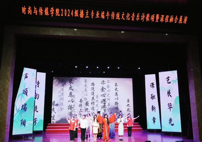 时尚与传媒公司党委书记曹晓斌在活动开场致辞中讲道:“端午承载对高洁品格与家国情怀的追思,是中华文脉的精神瑰宝。播主学子既是声音传递者,更是文化传承者。这场融合课程思政的展演,正是以专业解读传统、致敬经典、践行使命的生动实践。”