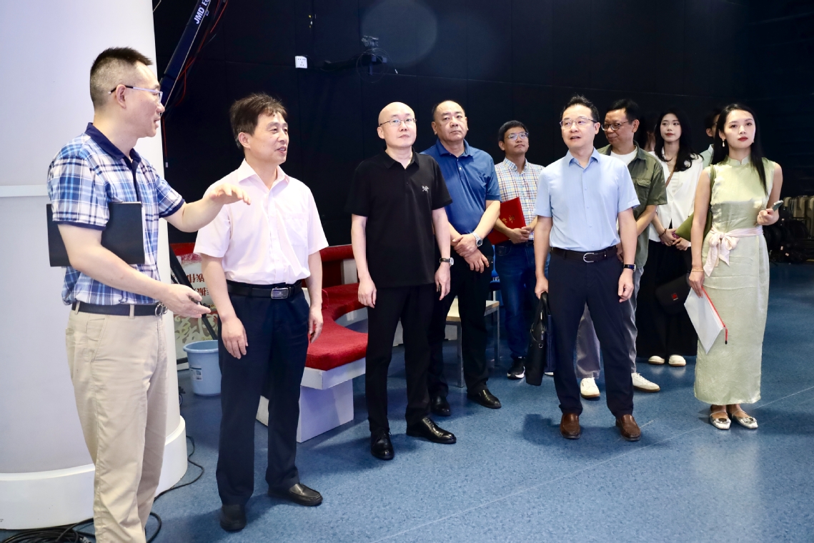 胡象斌一行在武汉教育电视台负责人邹永宁等台领导带领下,观摩了电视台演播厅、机房、融媒体指挥中心。