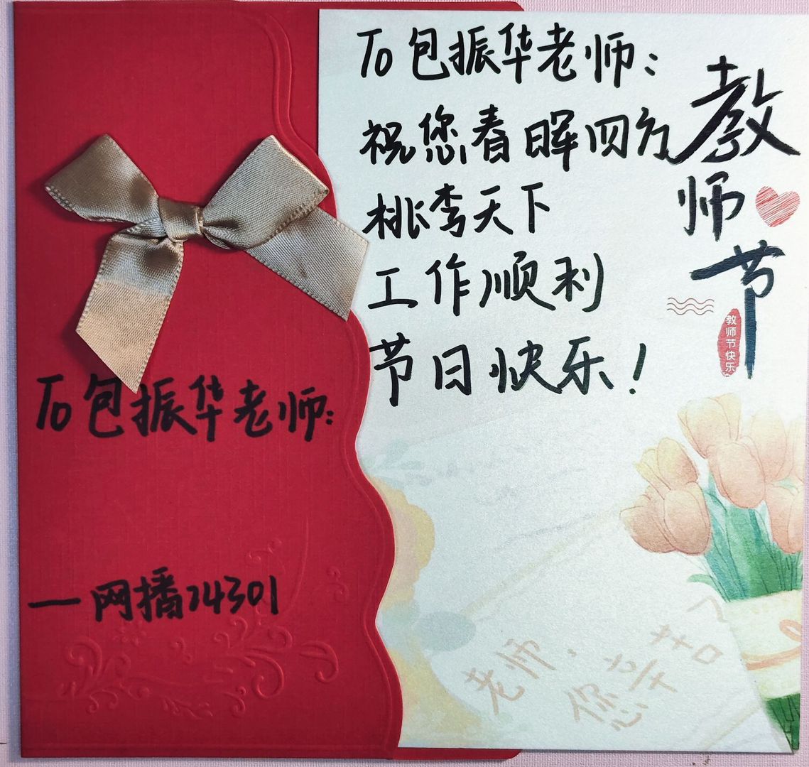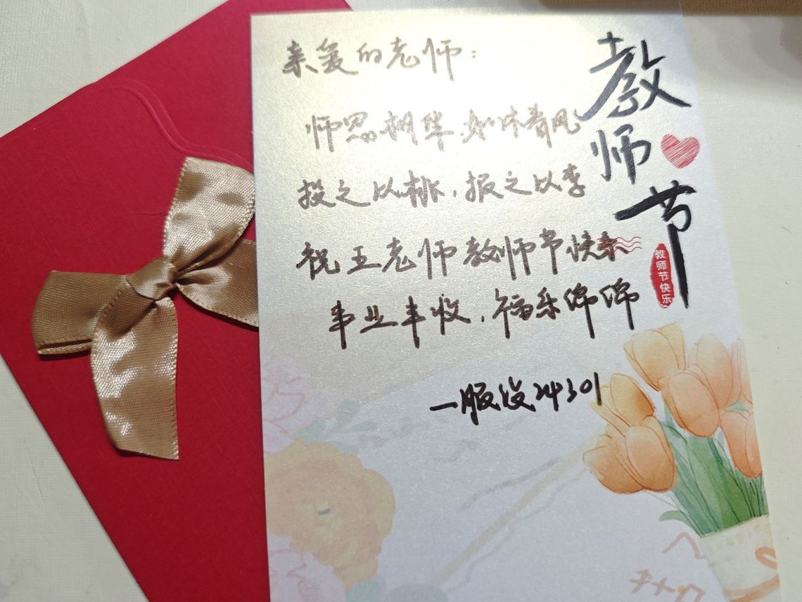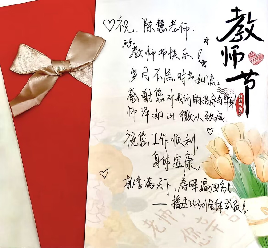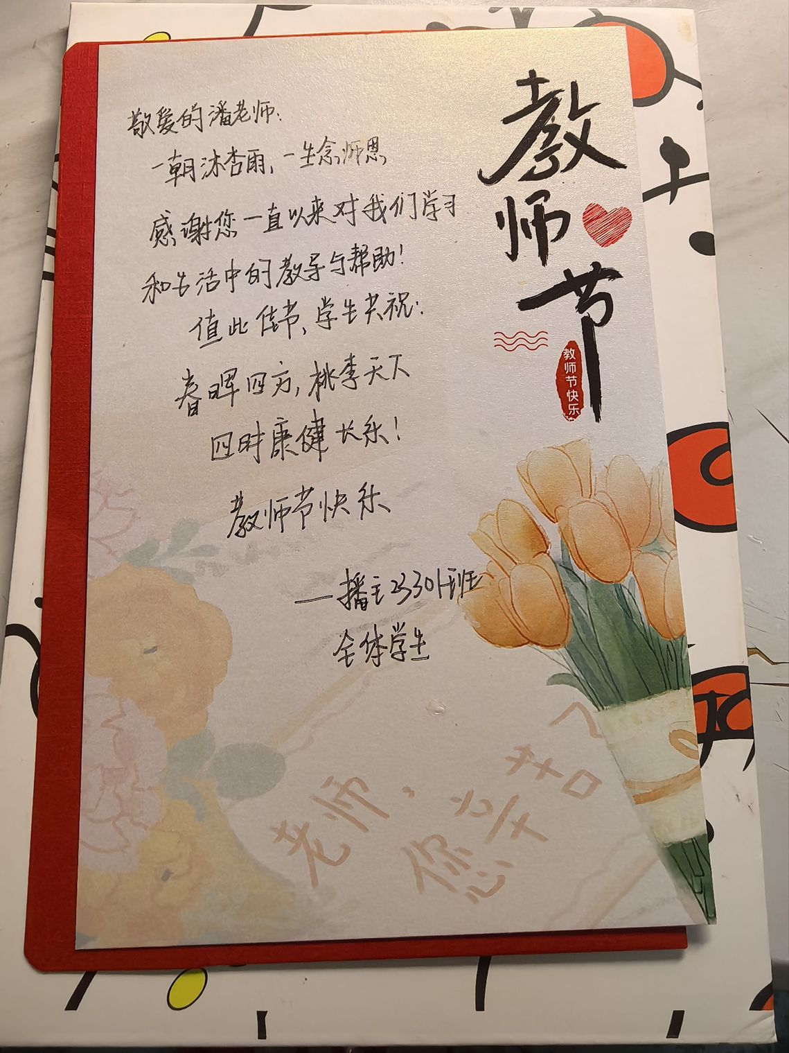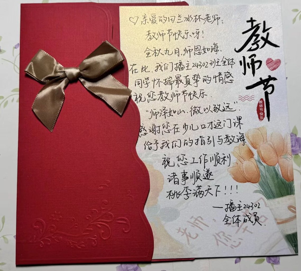 除了课堂上的惊喜,每个班集体还为老师准备了手写贺卡。同学们拿起笔,将对老师的感恩与祝福细细书写:“感谢老师每次课后耐心解答我的疑问,您的鼓励让我更有信心学好专业”“老师,您的课堂生动有趣,让我爱上了这门学科,祝您节日快乐”……一张张卡片,字迹或工整、或稚嫩,却都饱含着学子对老师的真挚情感。