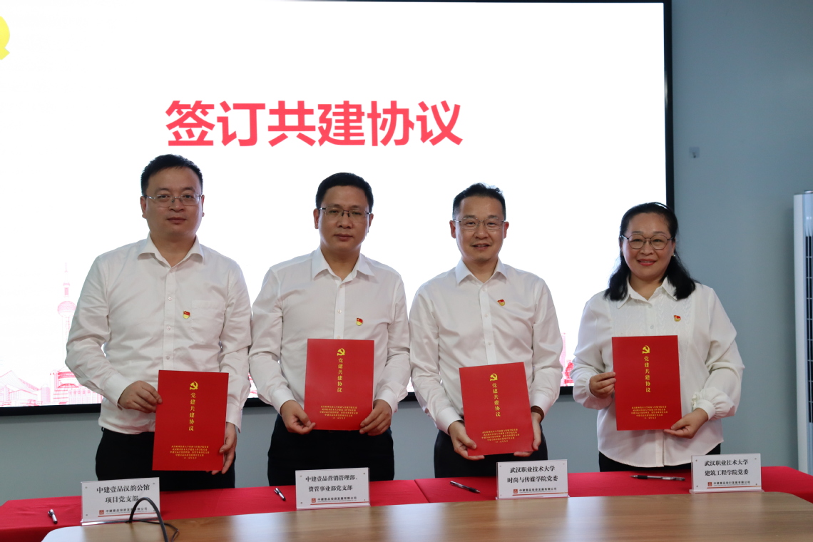 在全体人员见证下,时尚与传媒公司党委书记曹晓斌、建筑工程公司党委书记宋霞,与中建壹品营销管理部、资管事业部党支部书记夏英杰、项目部党支部书记吴诚共同签署《校企共建协议》。根据协议,中建壹品项目部将作为两院的“智能建造实践基地”,双方将围绕智能建造技术研发、数字化营销实践、专业人才培养三大方向展开合作。