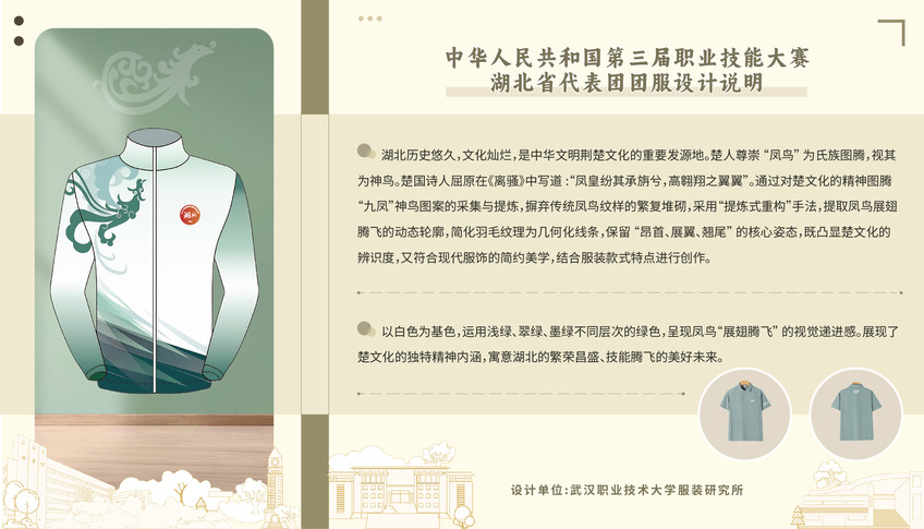 在色彩搭配方面,设计以白色为基色,搭配浅绿、翠绿、墨绿三个层次的绿色,通过色彩递进呈现凤鸟“展翅腾飞”的视觉效果。“白色象征职业技能的纯粹与专业,绿色既呼应湖北‘千湖之省’的生态特色,也寓意技能人才的成长与活力。”