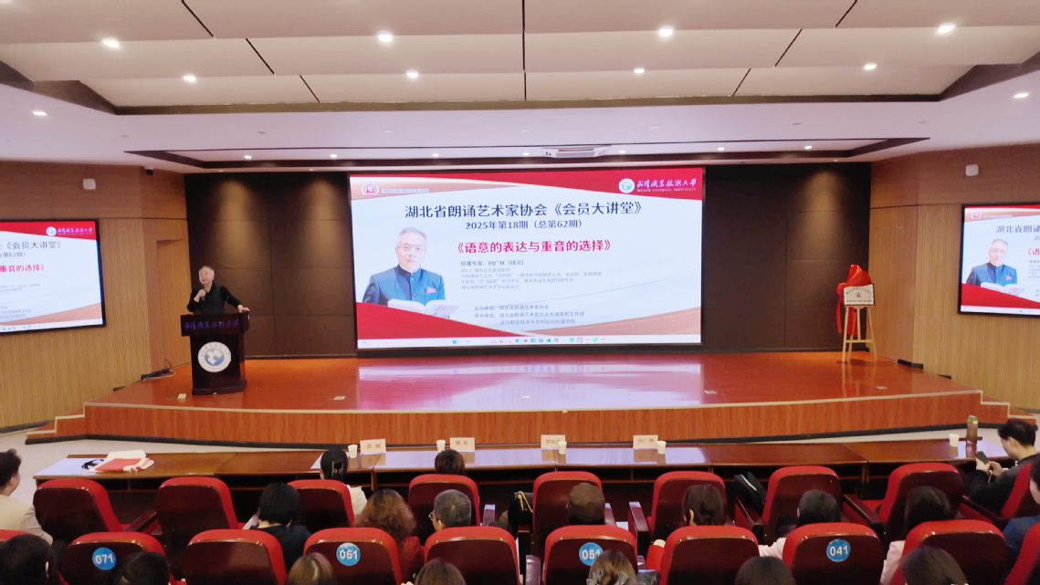 作为活动核心,中国文化大讲堂之“声动荆楚,文韵传情”专场讲座同步开讲。省朗协副会长、湖北广播电视台播音指导何广林以《语意的表达与重音的选择》为题,从“文本解读、情感共鸣、声音塑造”三个维度分享,结合《相信未来》等经典篇目现场示范,他特别强调“朗诵是用声音为文字画像,传递文化温度”。在互动环节,他对员工朗诵作品点评,针对“方言口音矫正”“即兴表达技巧”等问题提供指导。2024级播音专业员工孙亦凡说:“讲座让我明白语言艺术不仅是专业技能,更是文化传承的载体,未来会积极参与基地实践提升能力。”